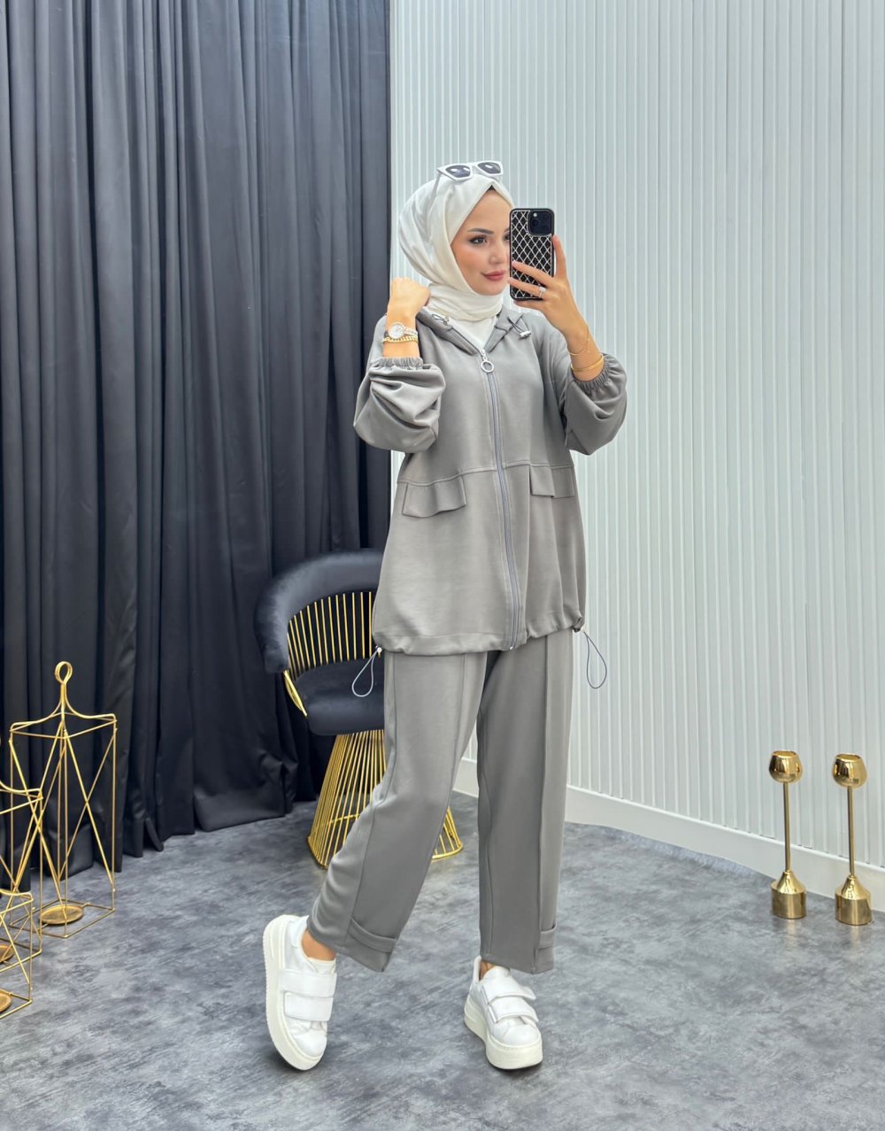 Tunik boydan fermuarlı, kapüşonlu ve cep kapaklıdır(Cep işlevli değildir.).