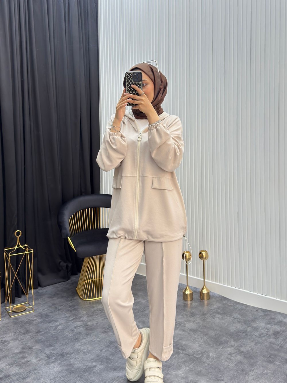Tunik boydan fermuarlı, kapüşonlu ve cep kapaklıdır(Cep işlevli değildir.).