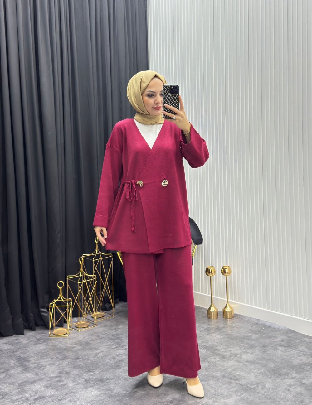 tunik önden düğmeli ve bağcıklı pantolon beli lastiklidir