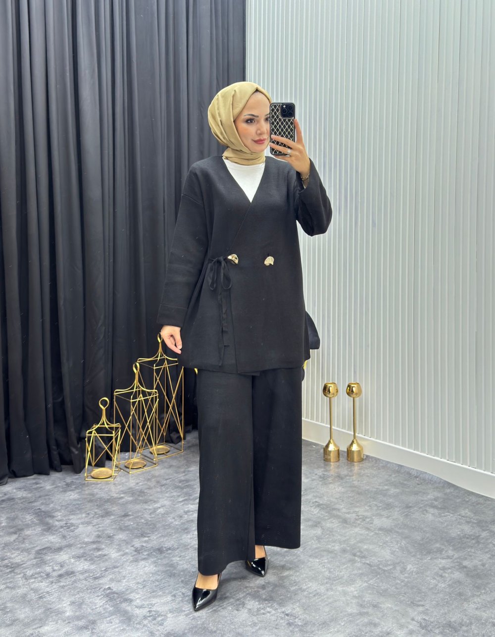 tunik önden düğmeli ve bağcıklı pantolon beli lastiklidir