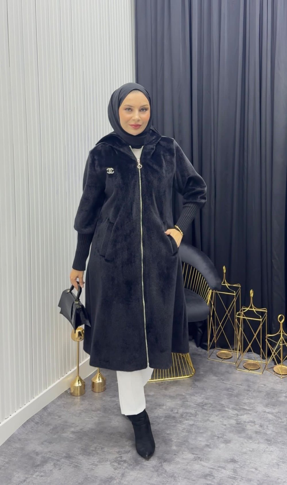 Ürünün Boyu:100/105 cm önden fermuarlı astarlı kapüşonlu yanlardan cepli  broş detaylıdır