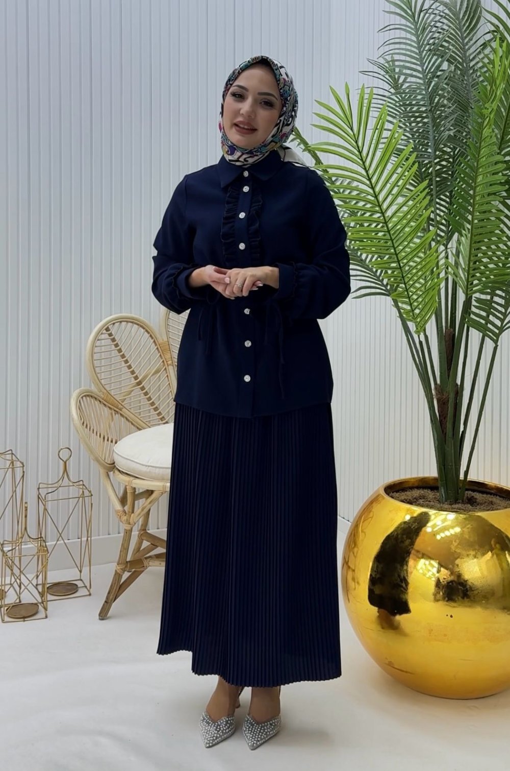 ürün gömlek etek olmak ve seyyar kemer olmak üzere 3 parçadan olusmaktadir gömlek düğmeli etek beli lastikli ve piliselidirMevsimlik kullanima uygundur