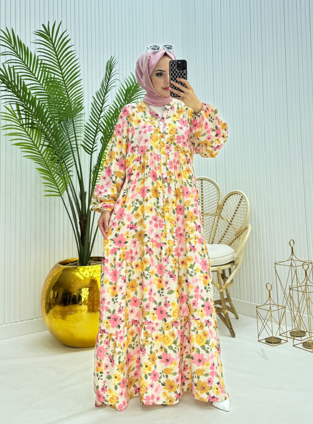 Çiçekli Tesettür Elbise Pembe