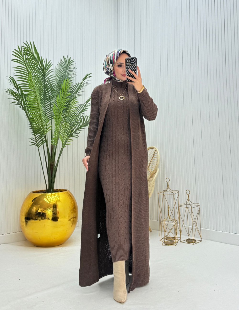 Ürünün Kumaşı ;%100 Triko Örgülü Kumaştan İmal Edilmiştir. Ürünün Beden Aralığı ;standart beden 36-42 beden arası uyumlu Ürünün Boyu;elbise 130 hırka 135 cm Ürün iç elbisesi uzun kolludur ve üstünde hırkası mevcuttur Kışlık kullanima uygundur Ürün renginde konsept çekimlerinden dolayı ton farklılığı olabilir