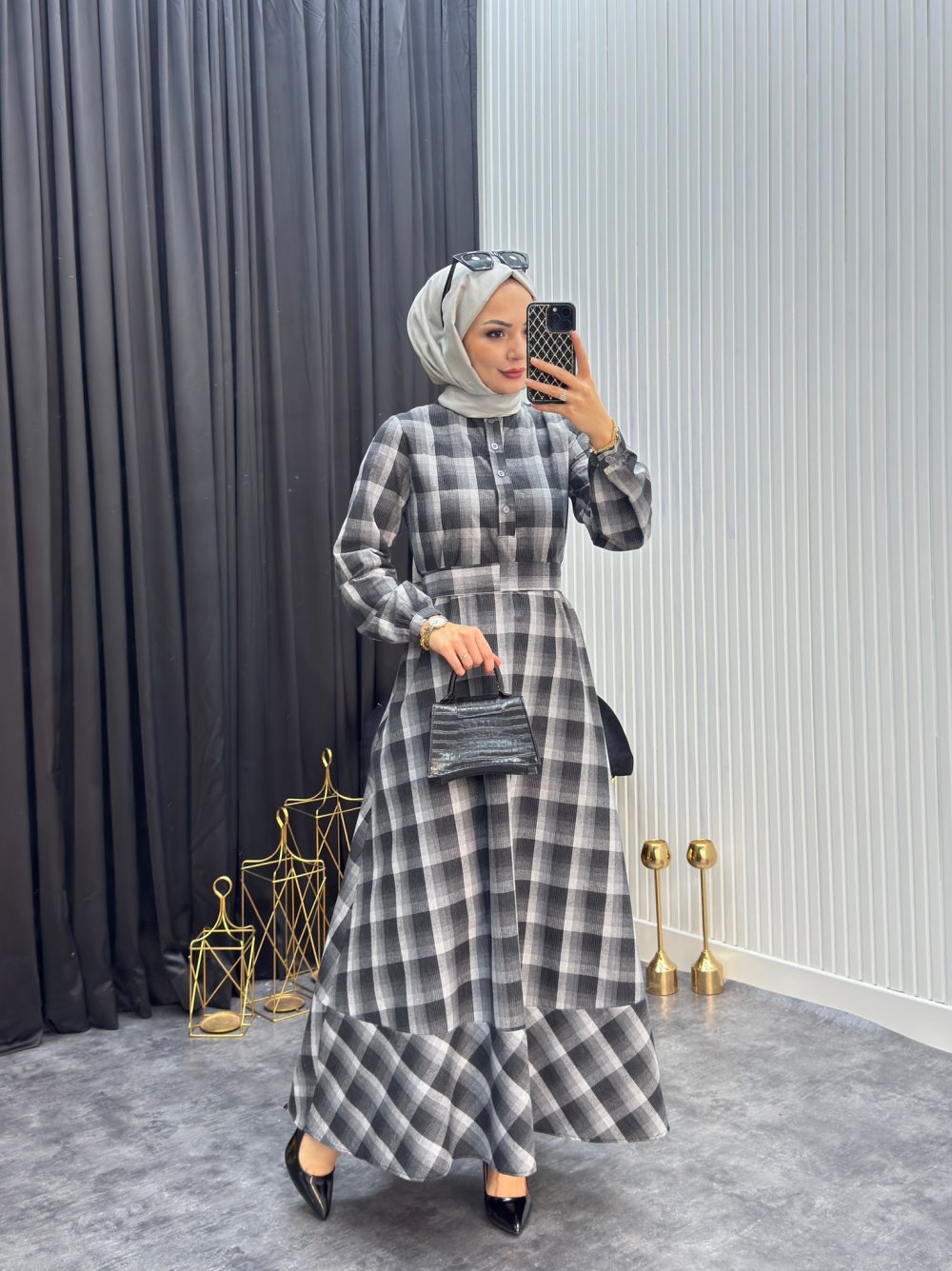 Ekose Elbise Füme