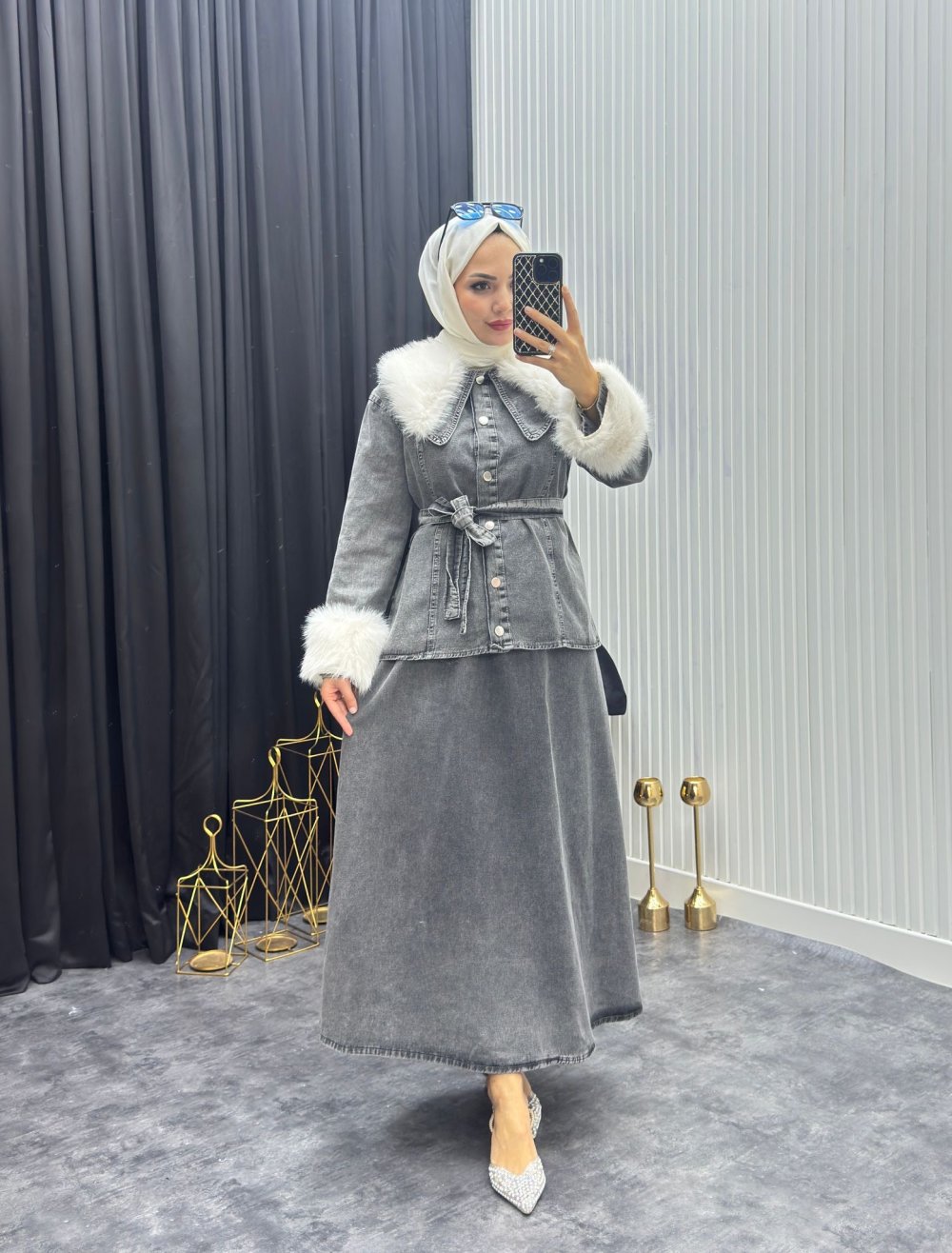 ürün kot ceket ve kot etekten oluşmaktadır etek beli lastikli seyyar kemerlidir yaka ve kollardaki detaylar portatiftir
