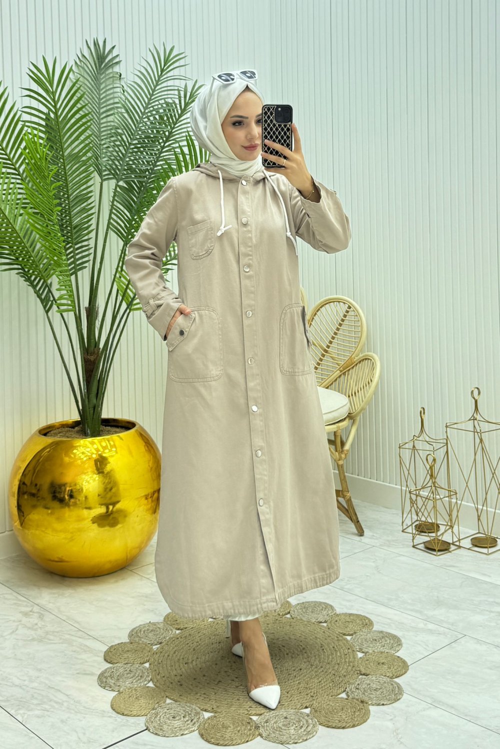 Ürünün Boyu:130 cm önden düğmeli cepli kapüşonlu Mevsimlik kullanima uygundur
