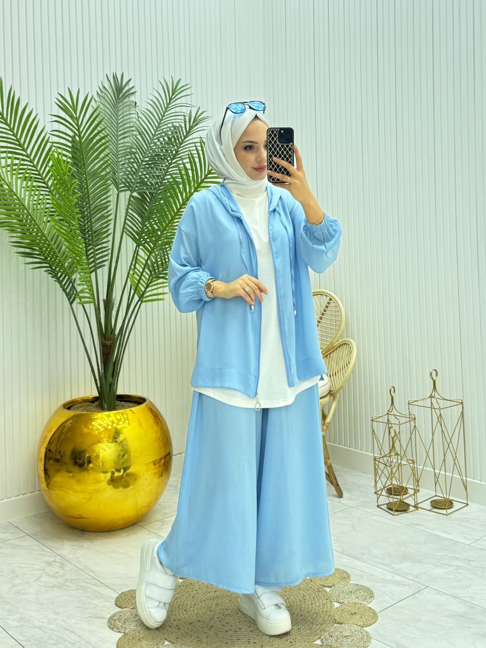 Tunik boydan fermuarlı, kapüşonludur. Pantolon beli lastikli yandan ceplidir