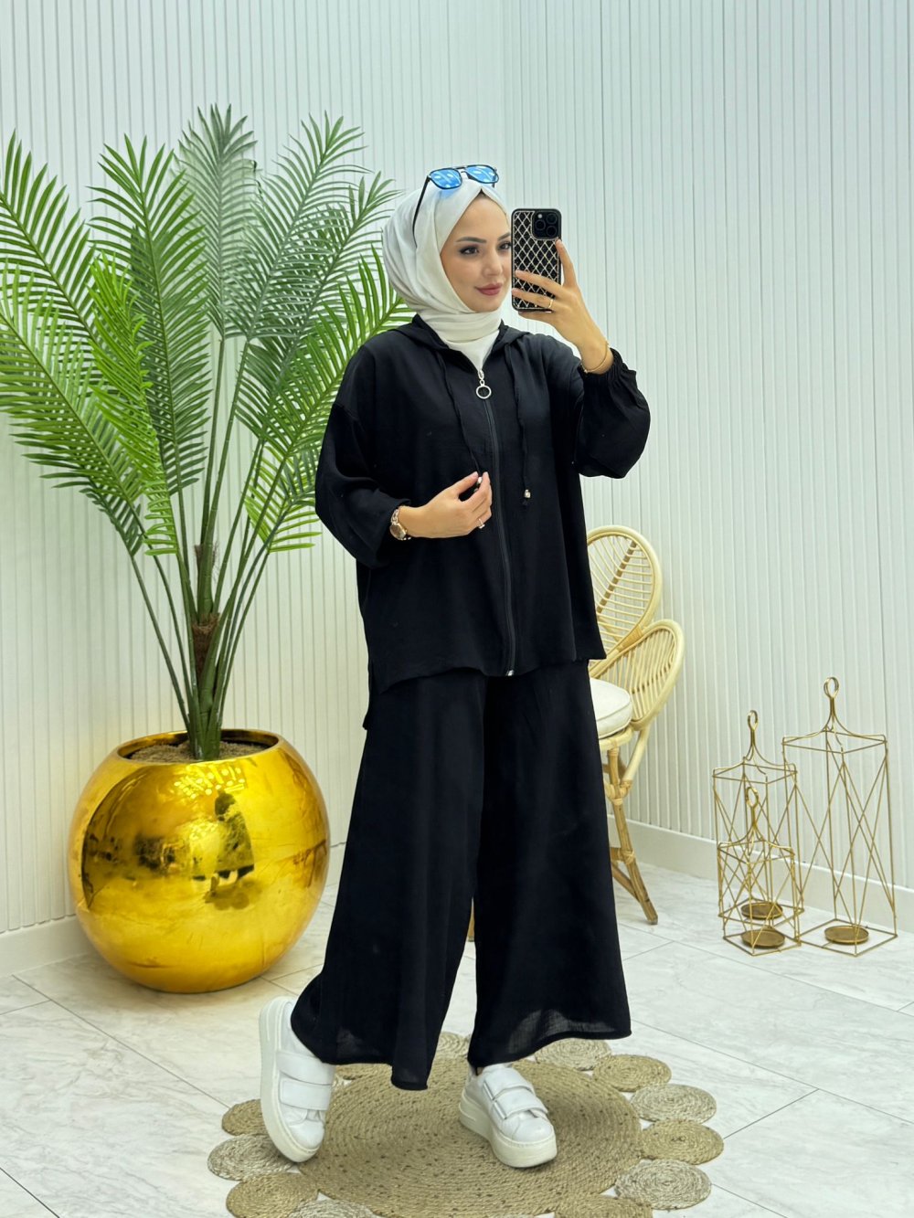 Tunik boydan fermuarlı, kapüşonludur. Pantolon beli lastikli yandan ceplidir